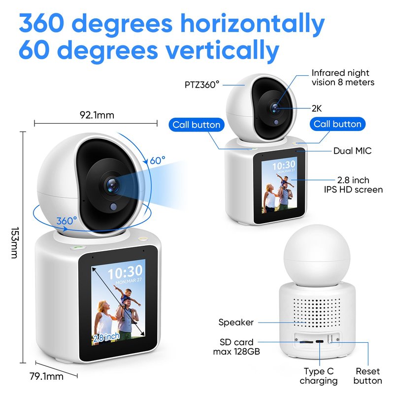 - 【One-Button Call】The Video Calling Smart Camera allows for easy video calls between mobile phones and the device. This feature is particularly useful for families with elderly or young children who may have difficulty using a mobile phone. With just one button press, anyone, from elderly individuals to young children, can make video calls and check in on their loved ones from anywhere and at any time.