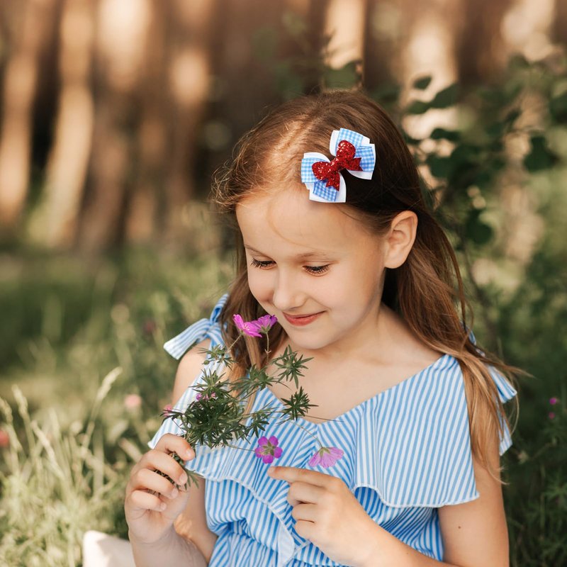 - Bow with 3 layers design, red sequin bow, blue check and white satin perfect superposition, three-dimensional cute.