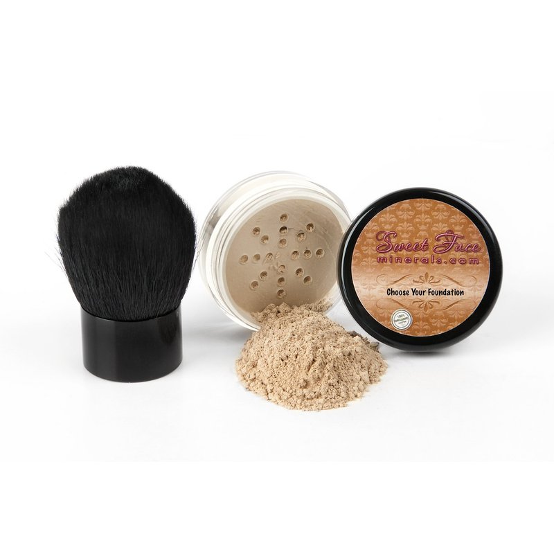 Mineral Foundation: Sweet Face Minerals foundations are all natural and very lightweight. Our products never appear heavy or look caked and are wonderful for every skin type. Will not cause irritated itching skin or acne. Large Full Coverage Kabuki: The silky head of this brush will cover large areas for quick results. Includes an instruction card for applying your makeup like a pro. Pure Ingredients: Titanium Dioxide, Zinc Oxide, Iron Oxide, Sericite, Rose Powder, Kosher Grade Rice Powder, Mica, Kaolin Clay. This kit contains a 20 gram sifter jar filled to capacity with 9 grams of powder.Made in the USA Animal Cruelty FreeAll Natural