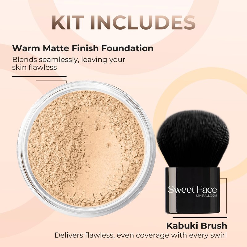 Mineral Foundation: Sweet Face Minerals foundations are all natural and very lightweight. Our products never appear heavy or look caked and are wonderful for every skin type. Will not cause irritated itching skin or acne. Large Full Coverage Kabuki: The silky head of this brush will cover large areas for quick results. Includes an instruction card for applying your makeup like a pro. Pure Ingredients: Titanium Dioxide, Zinc Oxide, Iron Oxide, Sericite, Rose Powder, Kosher Grade Rice Powder, Mica, Kaolin Clay. This kit contains a 20 gram sifter jar filled to capacity with 9 grams of powder.Made in the USA Animal Cruelty FreeAll Natural