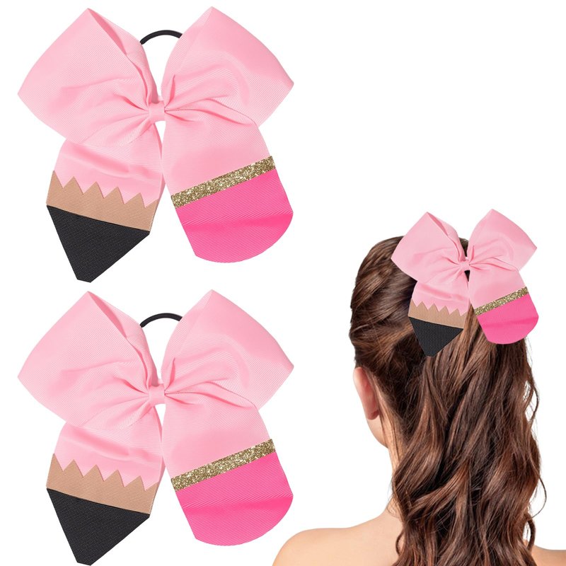 2Pcs Back to School Hair Bow Ties Pink Pencil Hair Ties Big Cute Scrunchies Teen College Elastic Ponytail Holder Cheer Sports Hair Bows for First Day of School Great Holiday Gifts for Students Girls