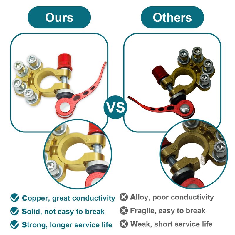 - 【EXCELLENT QUALITY】With superior corrosion resistance and electrical conductivity, the tinned copper quick release battery terminal also can reduce voltage distortion and transmission loss.
