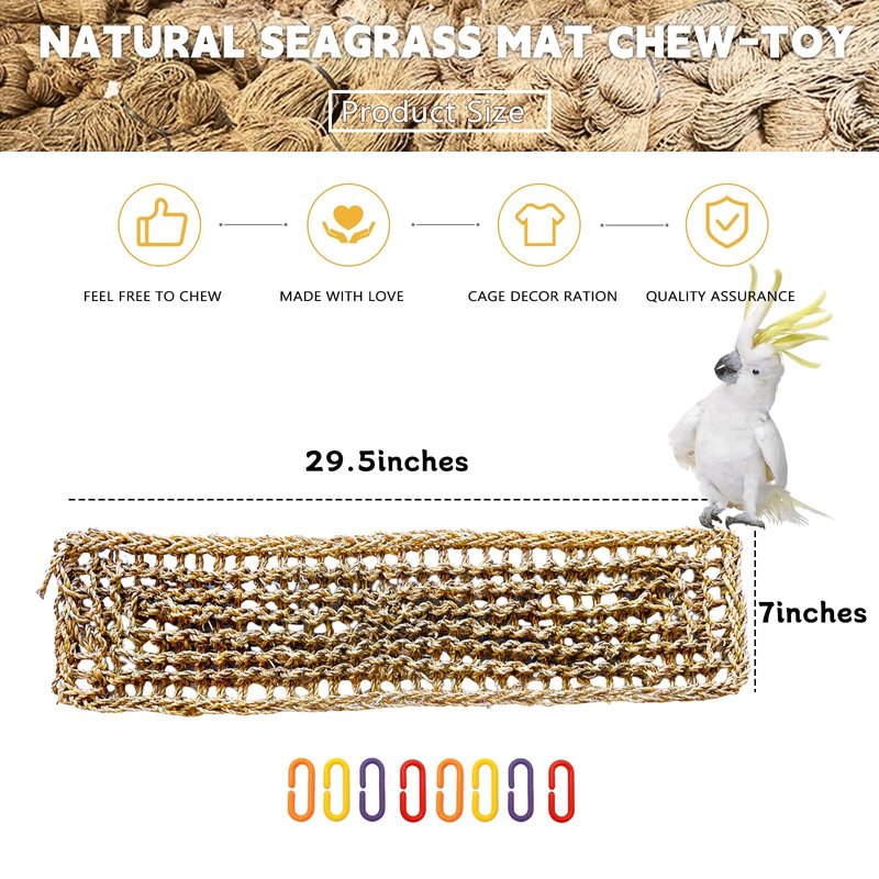 - 【Natural Seagrass Mat for Birds】2pcs 29.5×7inch large size,With 8 hooks. Handwoven from 100% seaweed fiber, woven very tightly, perfect for birds to chew and climb. Safe and reliable, meet most birds like to climb, bite, peck nature. Provide a comfortable place for your feathered friend to rest.