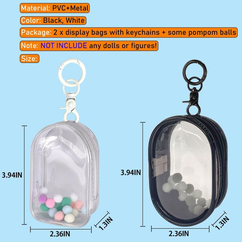 - SIZE PACKAGE: The clear figure display bag measures 3.9 x 2.4 x 1.4 inches for small collectibles. Please measure your collection before purchase to ensure the right size. Package: 2 x oval doll storage bag (Black and White) + some decorative balls (Random Color). Any figures or dolls are NOT included