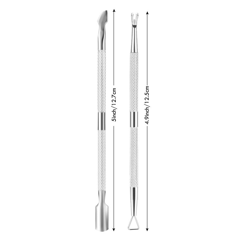 - 4 in 1 Manicure and Pedicure Tool Set -- Including cuticle pusher, cutter flat head, cuticle pusher cutter sharp head, dead skin fork and triangle nail polish scraper. Use the flat head to gently push back the cuticles on your nails. Use the triangle head to peel or remove gel nail polish; Use the cuticle pusher cutter sharp head push down the cuticles at the corners of your nails. They are great beauty tools for manicure and pedicure.