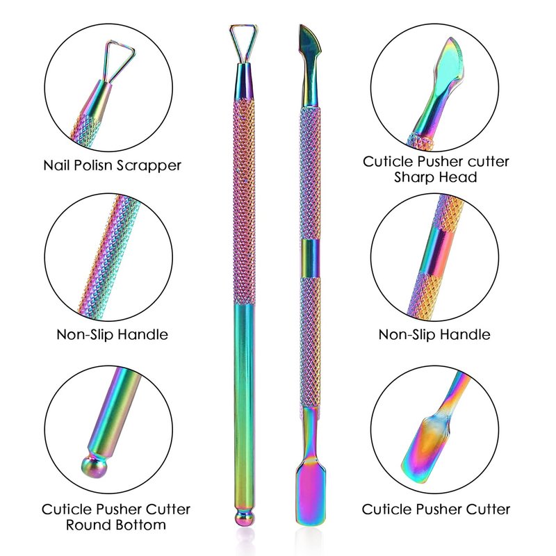 - ❤Special&Practical Design❷: Triangle design colorful cuticle pusher make it easily and quickly to remove your nail polish, nail scraper no injury to the fingernails; these nail tool is made of sturdy and durable stainless steel without rusting,textured handle will add grip to good control the cuticle pusher set.Ergonomic rounded handles with texture for a positive grip, a non-slip handle for easy control;