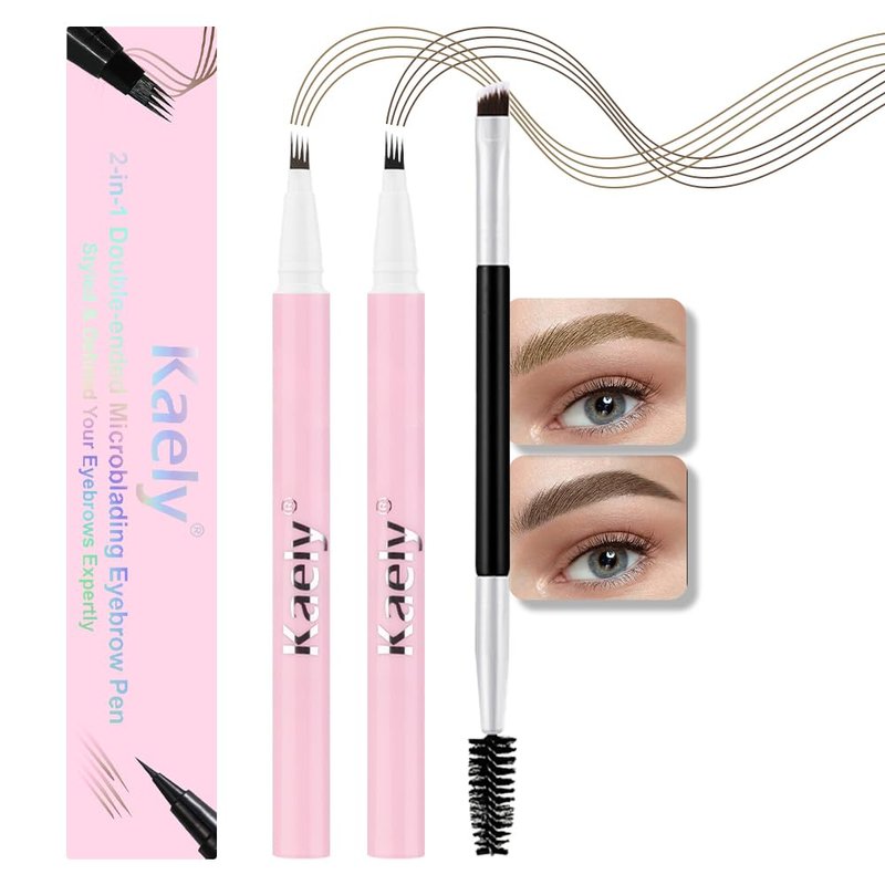 2pcs Dark & Light Brown Magic Microblading Eyebrow Pencils with 4 Brushes Micro-fork Tip Precision Applicator, Single-ended Eyebrow Brush, Waterproof and Long-lasting, Eyebrow Pencils for Women, 01+02