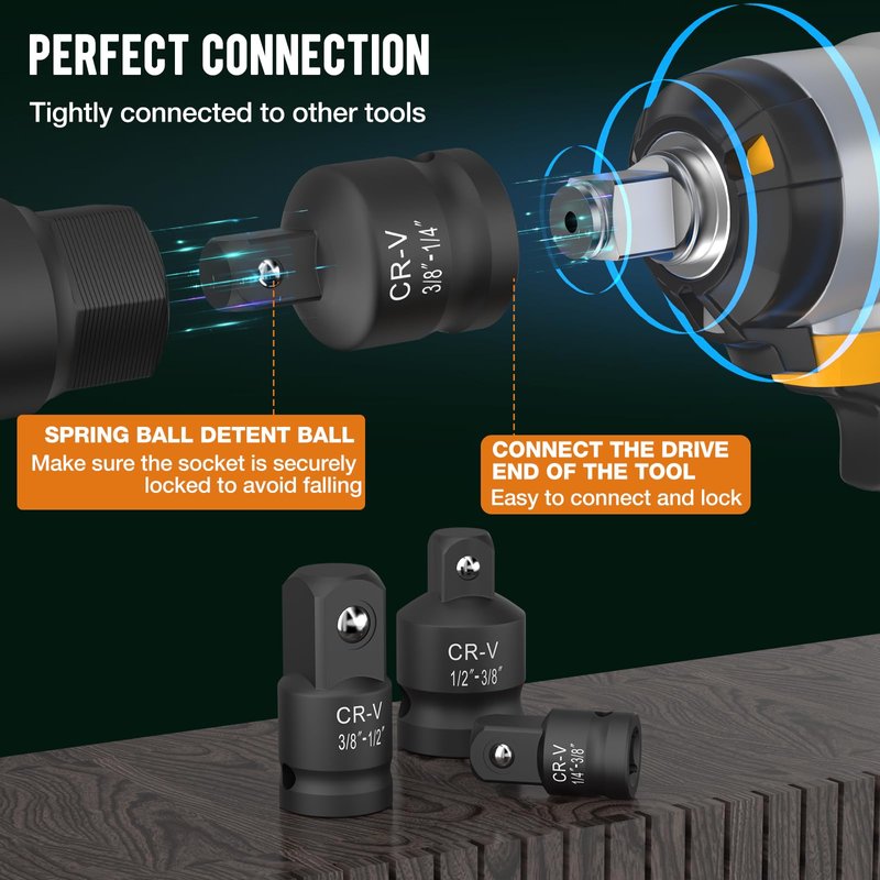 - 🧰PROFESSIONAL DESIGN: Each socket reducer comes with a built-in spring loaded stop ball that locks securely into the socket for better protection against dislodging and a torque function.
