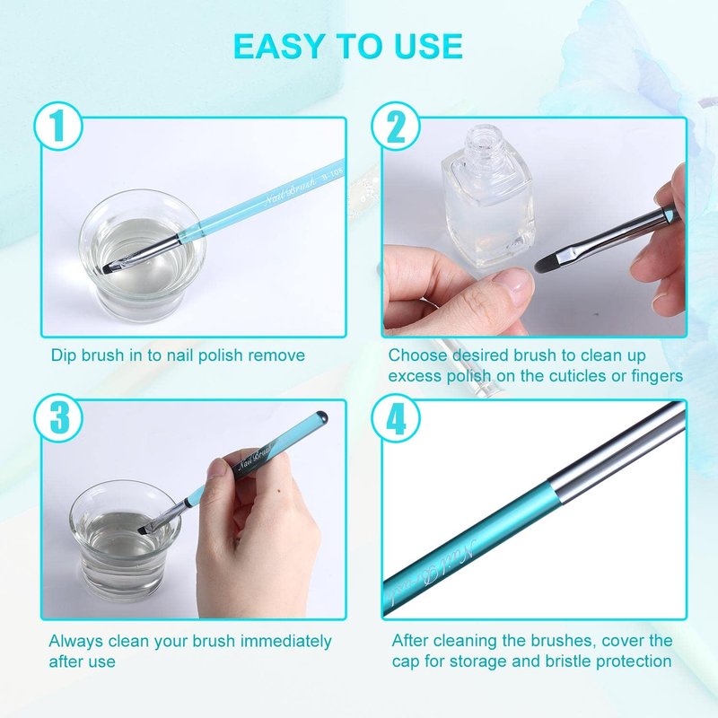 - Wide Usage: Every nail clean up brush has a protective cap to keep the bristles clean. The nail clean up brush will make the nail art process easier. Very suitable for Salon and home using.