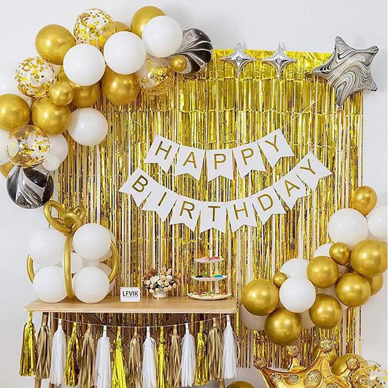 - This package contains pack of 2 gold fringe backdrop, each backdrop size:3.28 feet (W)*6.56 feet (L). A roll of scotch tape, 3.1 inch (W)*88 feet (L).