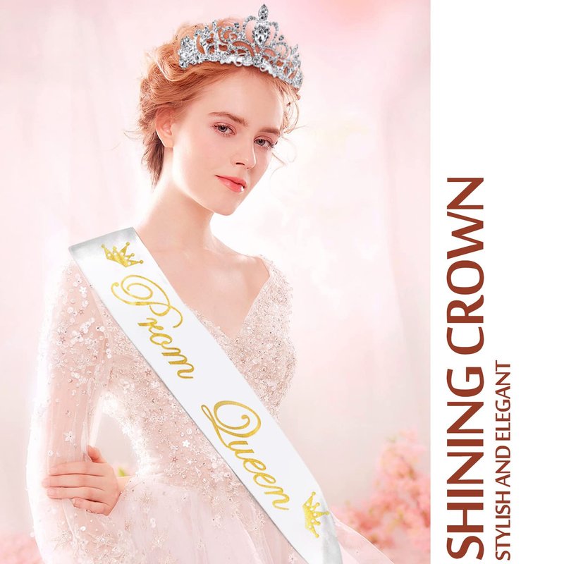- ♛【Prom Queen Sash and Crown】Contains a beautiful silver rhinestone crown, a satin sash. Provide you good combination of party costume accessories,exquisitely charming, gives you the feeling of aristocratic, making you look more glamorous, sweet, and attractive for any occasion like a real princess.
