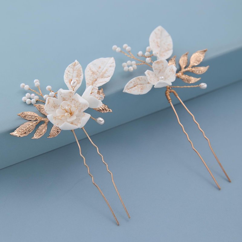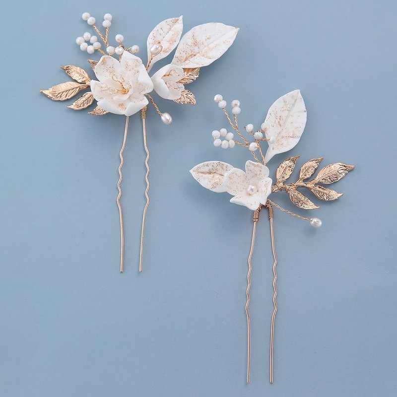 - Elegant Design: These wedding hair pins feature an exquisite floral motif crafted with delicate pearls and metallic leaves for a timeless, romantic look.