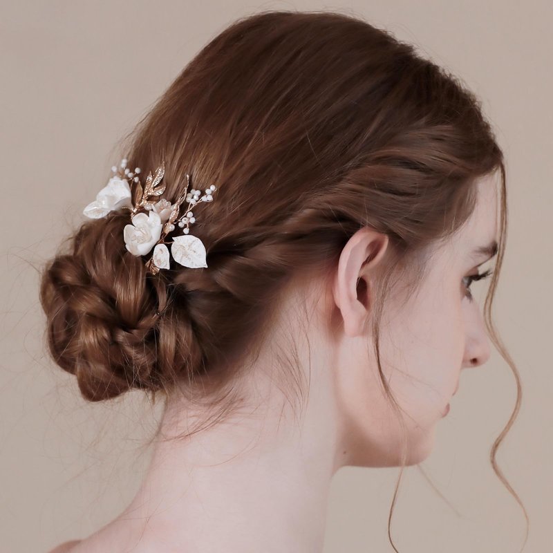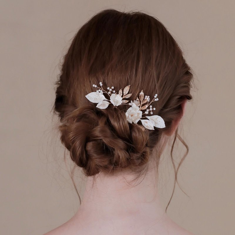 Elevate your bridal look with these exquisite wedding hair pins. Crafted with delicate porcelain flowers and intricate leaves in a beautiful rose gold finish, these hair accessories add an enchanting touch to your special day. The pearls and beaded accents lend an elegant and timeless charm. With their long, flexible stems, these pins can be effortlessly woven into updos or half-up hairstyles, allowing you to create a romantic, ethereal look that will leave a lasting impression. Whether you're a modern or traditional bride, these versatile hair pins will complement your bridal ensemble perfectly.