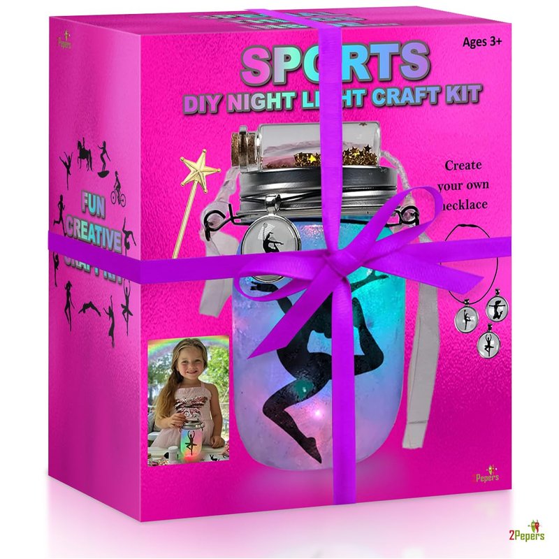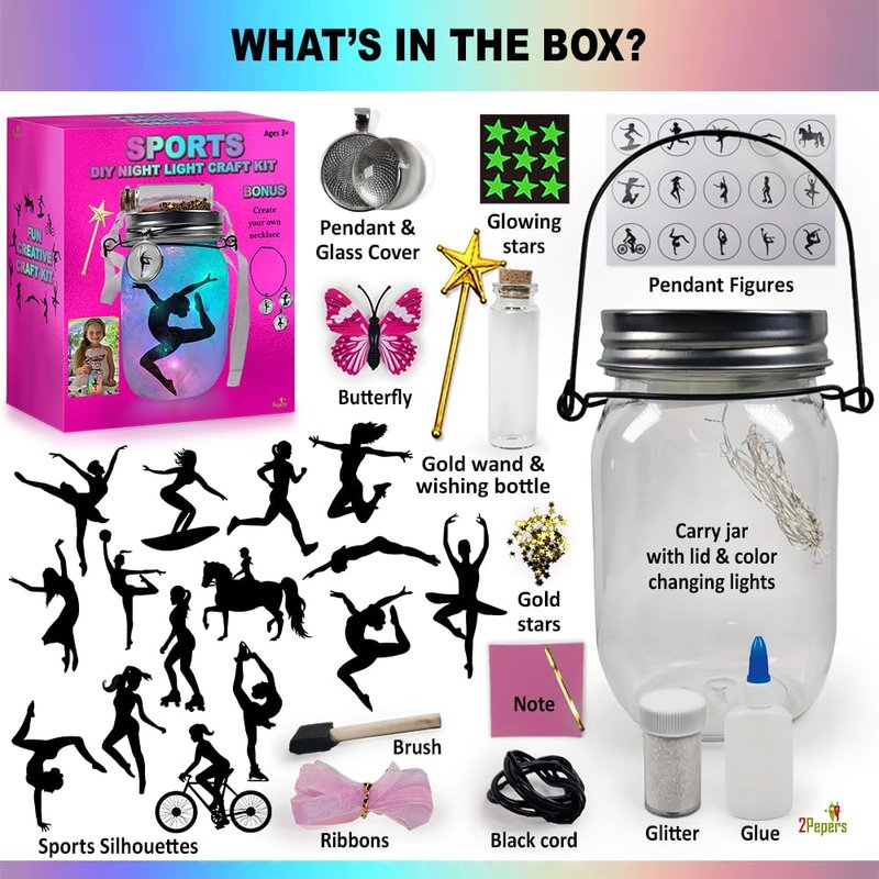 HANDS-ON CRAFTS This craft kit has it all! Perfect sports toys for girls ages 3 4 5 6 7 8 9 10 11 12 and teens. DIY nightlight project that girls can decorate on their own. Stunning, special and more exciting than any other toy! A PERFECT GIFT RECOMMENDED FOR ANY OCCASION! Are you trying to find fun unique craft toys for girls age 3 years and up? Let us help you! 2Pepers DIY sports night light arts and crafts for girls is exactly what you are looking for. Great as a birthday gift, Christmas gift, craft for girls, teens gift, top presents for boys and girls, Easter gift, Valentine's Day gift for kids and much more. Includes an impressive packaging and a well-written instruction manual. THE ULTIMATE FUN GIRL TOY! A COMPLETE KIDS CRAFT KIT Develops creativity and imagination. Easy to make. Includes all the necessary craft supplies. Various design options. What's in the box? Plastic jar with handle & metal lid containing colorful LED lights. Pendant tray, glass cover and sports images. Magical wand & butterfly. Wishing bottle with a note and golden stars decoration. Glitter, glue, brush & many silhouettes to choose from. Black cord & colorful ribbons. Glowing in the dark stars stickers. Gift packaging and step-by-step instructions.10 11 12 and teens.