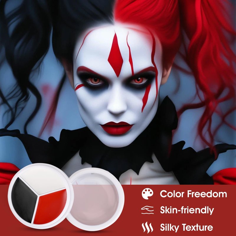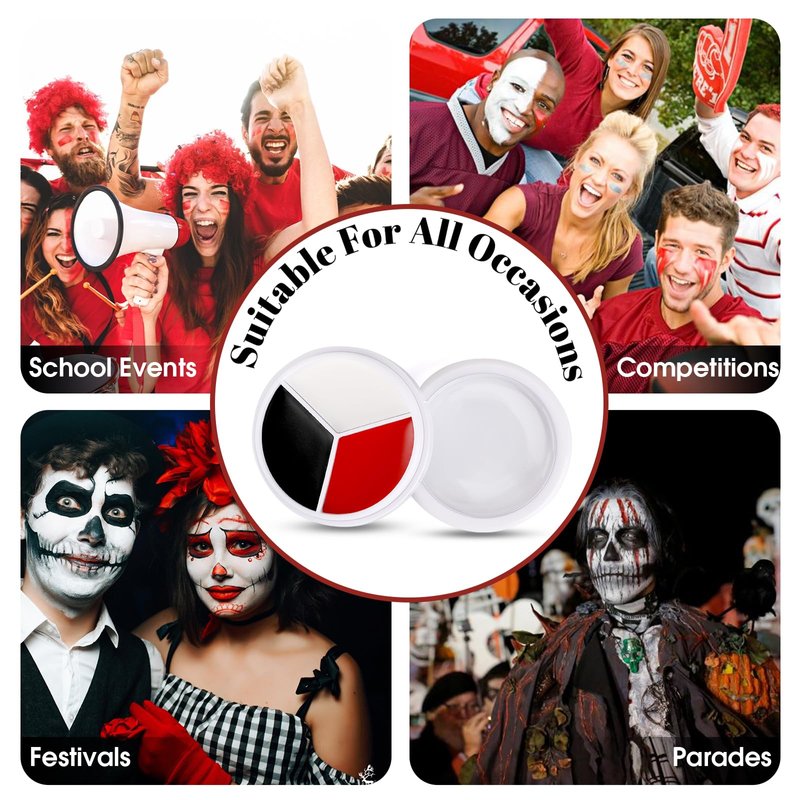 - MULTI-USE & OCCASIONS -- This Black Red White SFX makeup kit is suitable for use as a foundation base to create a variety of black red white face makeup. It is perfect for Halloween costume makeup, party, carnival, Cosplay, SFX makeup, special effects makeup, Day of the Dead makeup, festival makeup, stage or theater performance; Various Halloween fancy makeup, such as Zombie, White Clown, Vampire, Skeleton, Skull, Catrina, Joker, Witch, Sally Face, Avatar, Cat, Corpse Bride, Goth, Alien, Ursula, Devil, Gothic, Frankenstein, Mime, Werewolf, Camouflage, Monster, Camo, Goblin and other makeup