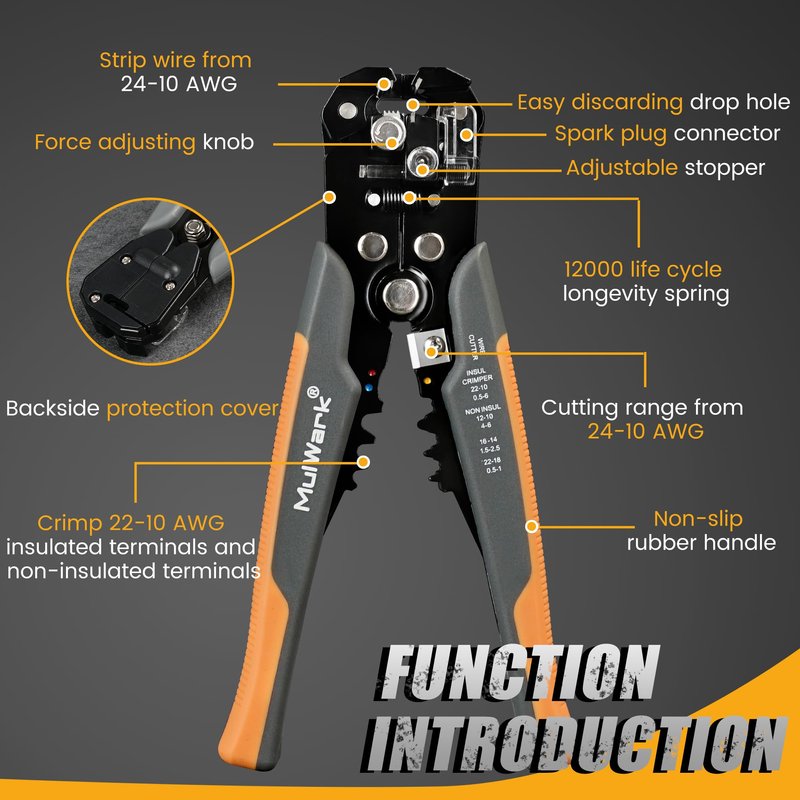 - MULTI-FUNCTION 3 IN 1 : Use this wire stripper tool to quickly and effectively strip, cut, and crimp, saving time and effort. It provides Cutting Range between 24-10 AWG, strips wires from 24 to 10 AWG, crimps 22-10 AWG insulated terminals and non-insulated terminals