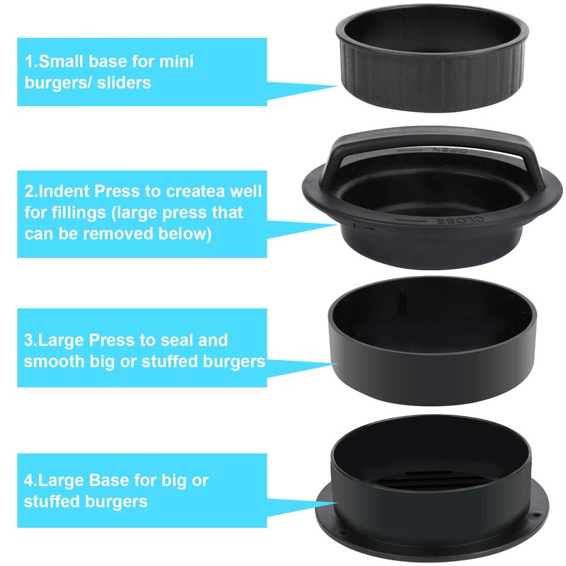 - 3 IN 1 STUFFED BURGER PRESS PATTY MAKER RINGS MOLDS KIT: Has 3 different functions parts. The bottom mold for big patty, the middle for stuffed patty, the top for small sliders and mini patty. One burger press will help you make three kinds of perfect round formed patty! The large base mold diameter about: 5.0 inch, large meatloaf diameter: 4 inch, 1/4-1/2 pound meat. The small base mold diameter about: 2.83 inch, small meatloaf diameter: 2.5 inch, 1/8-1/6 pound meat.