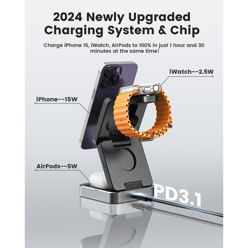 3-in-1 Wireless Charger for iPhone,15W Fast Wireless Charging Station Compatible with Mag-Safe Charger,Magnetic Foldable Travel Charger Stand Nightstand for iPhone 16/15/14/13/12,Apple Watch&AirPods