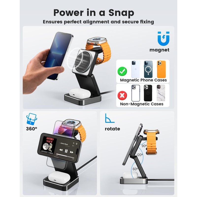 - 【Upgrade Powerful Mag-Safe Charger Stand】Mag-Safe charger 3 in 1 makes fast charging safe and easy. The built-in super strong magnet makes alignment instantly and precisely, just 1 second to achieve lightning fast wireless charging. The magnetic charger can hold your iPhone horizontally and vertically, or in any directions, the phone charging area can adjust the angle up and down by 120°, you can enjoy all your comfortable viewing from any angle.