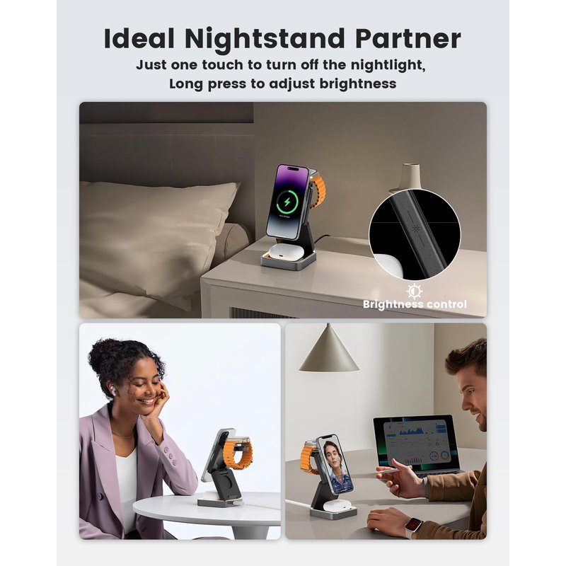 - 【Fast Wireless Charger Stand】Effortlessly charge for iPhone at a lightning-fast 15 W, for Apple Watch at a reliable 2.5 W, and for AirPods at a steady 3 W—all at once. Each device charges independently, without affecting the performance of the others. It takes only 2-3 hours to fully charge your devices, allowing you to enjoy the convenience of a single, fast, unified charging solution.[Note: To charge at full speed, please use a PD charger of 20 W or higher.]