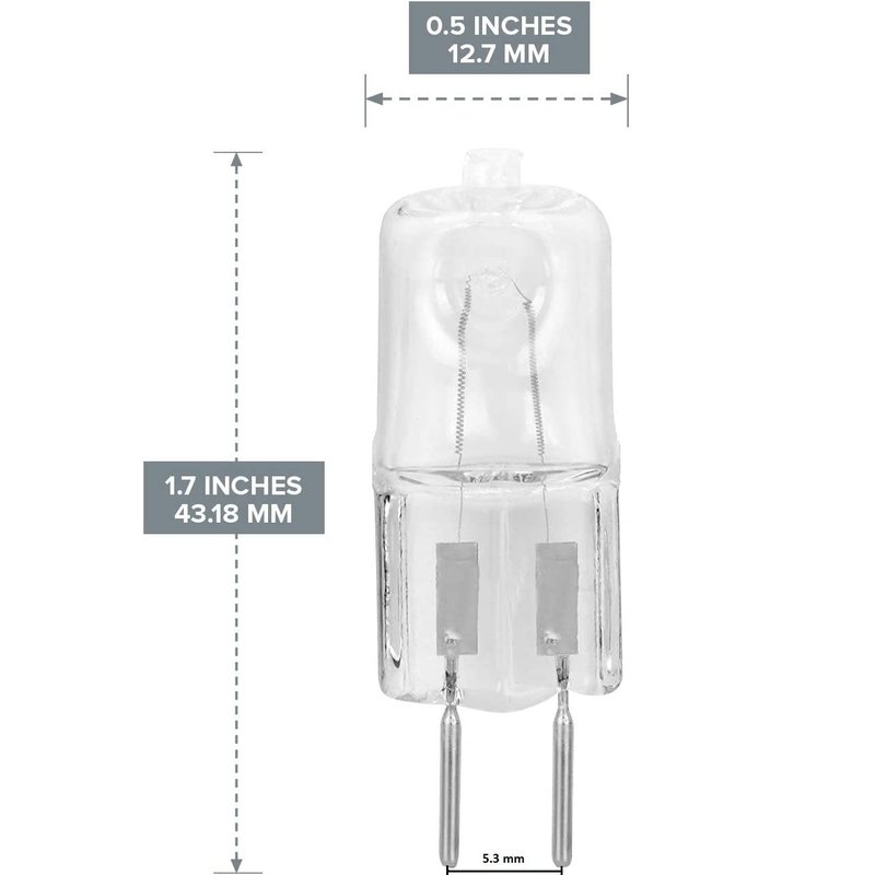 Specifications: Type G5.3 2-pins 35 Watts. They are approximately: 12.7mm wide (.5 inches), and 43.18 mm tall (1.7 inches). The pins are roughly 5.3 mm from tip to tip.