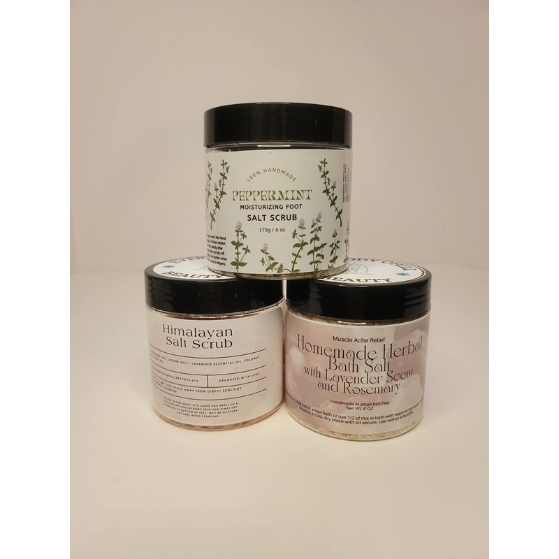 100% all natural, home and handmade 3 pack gift set for that at home spa experience. Perfect gift idea!! Can leave your body feeling relaxed and skin softer. Set includes: *6oz Peppermint Foot Scrub- Himalayan salt, Epsom salt, dried mint, coconut oil, peppermint essential oil *6oz Himalayan Salt Body Scrub- Himalayan salt, Epsom Salt, homemade peppermint infused olive oil, coconut oil *6oz Herbal Foot or Bath Salts- Epsom salt, Himalayan salt, coarse salt, baking soda, handmade powdered coconut milk, lavender essential oil, rosemary leaves Comes in an upcycled/repurposed box to make it look great! Store in a cool dry place for up to 6 months. Net weight 6 oz. Please allow up to 2 business days to be completed. It is HANDMADE Do not use if you have certain food or environmental allergies- message us with any concerns before purchasing Net weight of product is roughly 6 ounces ( can be more, can be a little less) Product is handmade at our home. Please message us with any questions. Scrubs be used on face, neck, body, hands, and feet Sit down when using on feet. They could get slippery. Thoroughly rinse off and dry.