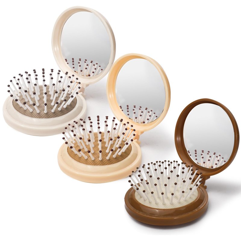 3 x Foldable Travel Hair Brushes with Compact Mirror