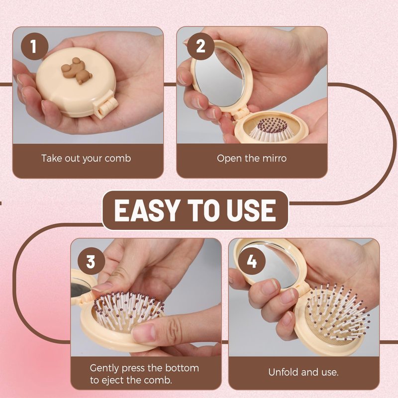 - 【Package Included】 You will receive 3 mini hair brushes with compact mirror in beige, white and coffee colors. These pocket hairbrushes are decorated with adorable bear patterns, adding a touch of cuteness and fashion to your hair care routine.