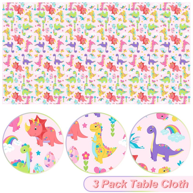 - Cartoon Dinosaur Party Tablecloth: 3 Pack of Plastic Tablecloths. Make your party roar with excitement with our adorable disposable rectangular tablecloth featuring a charming pink backdrop adorned with a variety of cartoon dinosaurs. Perfect for adding a playful touch to any dinosaur-themed party or celebration.