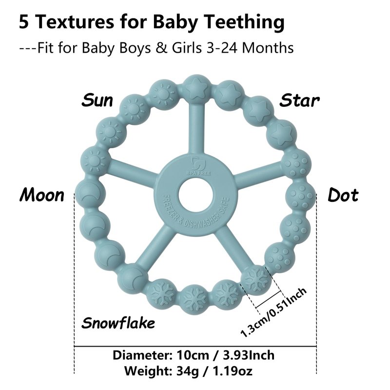 5 Teething Textures: Cute and funny ring teethers toy design with 5 different textures and bristles in both side to clean and soothe baby gums. (Sun, Star, Moon, Snowflake, Dot)
