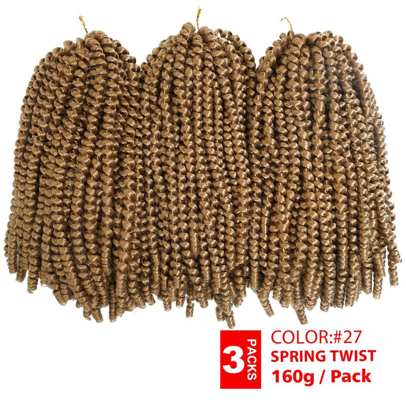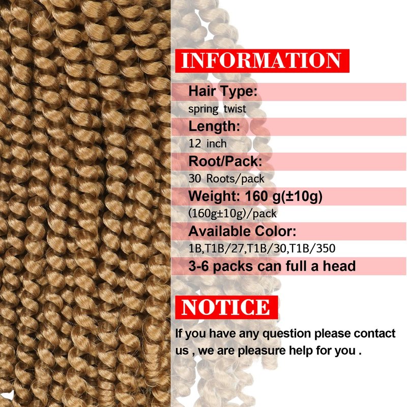 - Hair Size: 12 Inch, 160g/pack,Color:1B,T1B-27,T1B-30,T1B-350.Usually 3 Pcs is Enough with 30 Strands Spring Twist Hair.