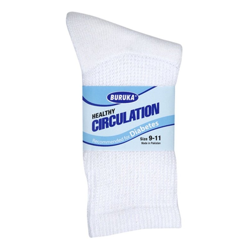 Buruka Men's White Diabetic crew socks are made from 88% cotton 10 % Nylon and 2 % Elastic . They are made for those with Diabetes , Edema and Swollen Feet. It provides neuropathy comfort support and better circulation. Not only that these socks aid in your health needs but the cushioning along the bottom provides additional comfort. Retail in pack of 3 pairs.****PLEASE NOTE SOCK FIT A BIT SNUG*** **SIZES 9-11 FITS SHOES 8-10** **SIZES 10-13 FITS SHOES 10-12** comfortably.