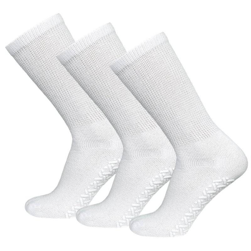 3 Pairs of Non-Skid Diabetic Crew Socks, Non Binding Top Therapeutic Cotton Gripper Socks (White, Size: 13-15)