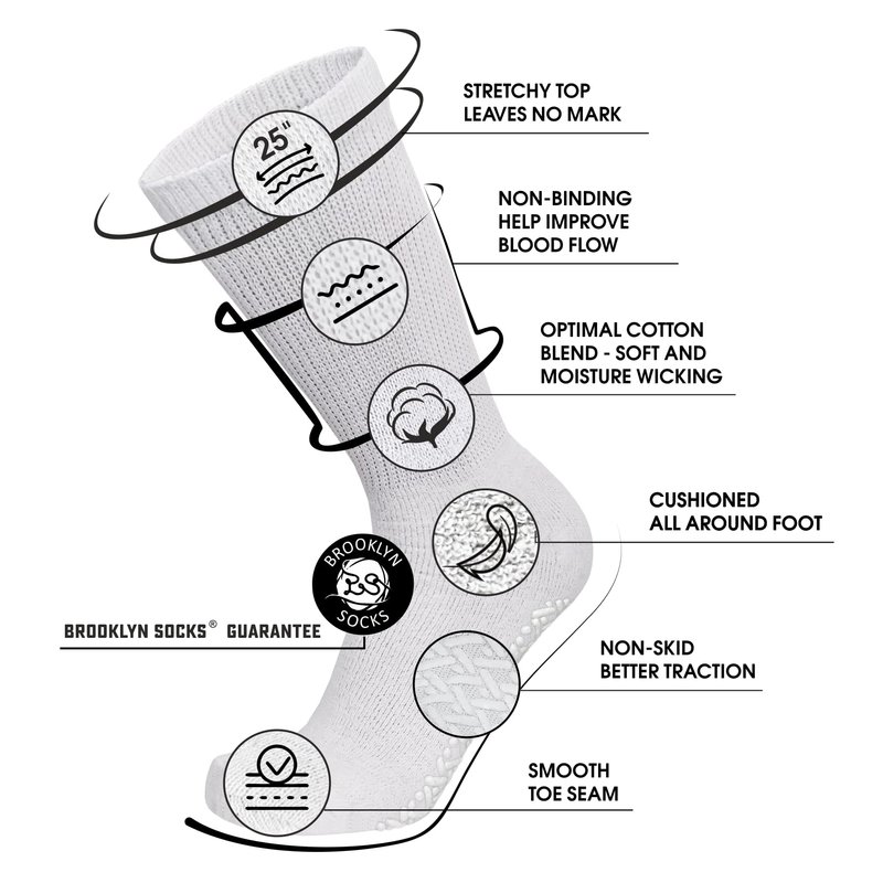 Feel the cushioned comfort in everyday step with excellent mens and womens diabetic socks with gripper bottom from Brooklyn Socks. Slip resistant tread grips provides greater traction on smooth surfaces such as hardwood, vinyl or tile floors. Our non-binding socks feature a loose knit design that provides proper cushioning without squeezing or constricting your legs. These must have diabetic socks are physician approved and highly recommended for people with diabetes, edema, and neuropathy caused by circulatory problems.