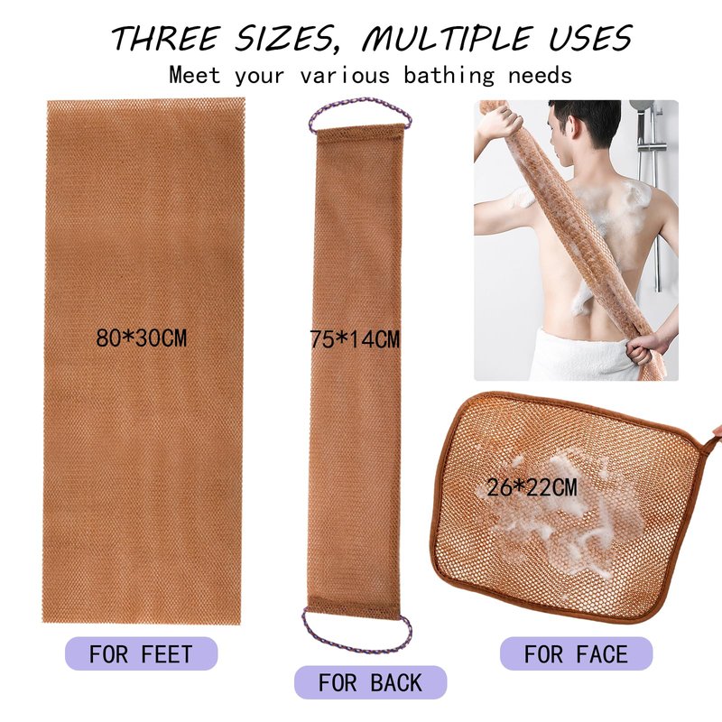 【100% African mesh sponge】3 pieces of African mesh sponge. One face towel, one back bath towel, one body bath towel, Clean your whole body and let you experience a different kind of physical and mental cleanliness. Note: slight fading is normal at first and will not fade after several uses, please soak the product in hot water for 15 minutes before use 【Good rebound and stretch】African mesh sponge is elastic and stretchable and will be longer when stretched, making it perfect for cleaning all areas of the body without dead ends, including the back, hands and feet. 【Better quality material】Our long bath net sponge is made of safe and reliable New type nylon materials, Durable and reliable, can be used for a long time, light but powerful, with its porous characteristics, the soap foam is more delicate and rich, suitable for machine washing, and dries quickly, providing you with a cleaner and more enjoyable bathing experience. 【More efficient cleaning】The exfoliating body net is rougher than a ordinary bathing cloth, but soft enough for daily body cleansing.easy for removing dead skin, dirt, oil, and eliminating impurities, unclogging pores, suitable for women and men of most ages to use 【After-sales peace of mind】We will collect customer suggestions,Used to improve the product,For this we provide 90 days unconditional returns and exchanges,You are welcome to consult at any time.