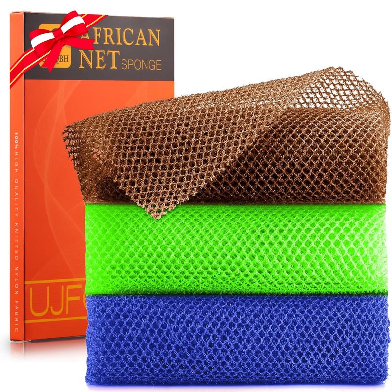3 Pieces African Bath Sponge African Net Long Net Bath Sponge Exfoliating Shower Body Scrubber Back Scrubber Skin Smoother,Great for Daily Use (Brown、Blue、Green)