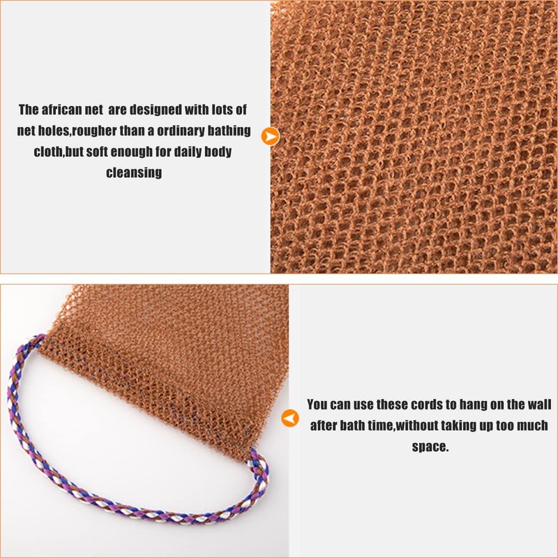 - 【Rope Design】The African sponge bath net comes with two hand strings, which are used in combination with the two ends,making it easy to reach the entire back.Makes scrubbing your back easier.You can use these cords to hang on the wall after bath time,without taking up too much space.
