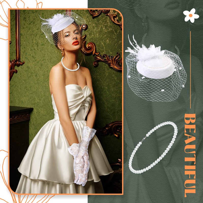 - Dazzling Presence Among People: women's pearl necklace, lace gloves and white fascinator hat can be widely applied on various occasions, including wedding parties, cocktail parties, tea parties, themed parties, photography, costume parties, carnivals, masquerades, weddings, ceremonies, birthday parties and more, providing you with impressive images among people