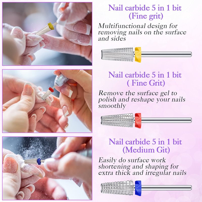 - Sturdy material: nail carbide 5 in 1 bit is made of quality carbide material, with good strength, good cutting performance, low heat generation, less dust, and long service life; It can complete various Nail Design tasks, such as shaping, polishing, smoothing, and grinding; Carving and smoothing gel nails or acrylic nails, suitable for personal nail lovers or nail salons