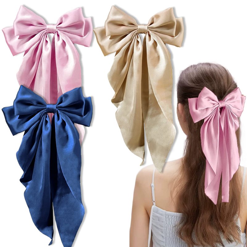 3 Pieces Silky Satin Hair Bow Larg Hair Bows Hair Clips for Women Soft Ribbon Hair Barrettes Plain Color Bowknot with Long Tail French Barrettes for Girls (Tibetan blue, Khaki, Pink)
