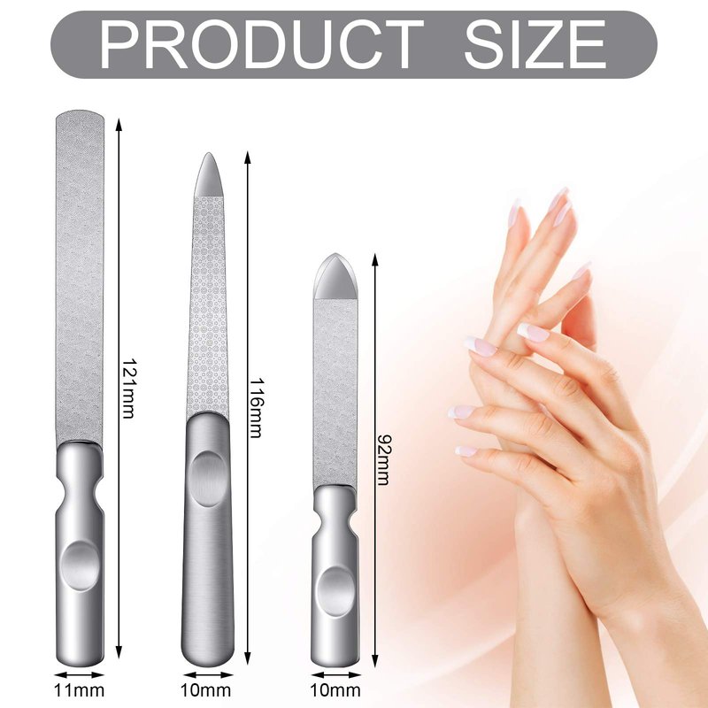 - Varied in dimensions: our stainless steel nail file buffers contain 3 various sizes, nail files with pointed head are approx. 116 x 10 mm/ 4.6 x 0.39 inches and approx. 92 x 10 mm/ 3.6 x 0.39 inches respectively, the nail file with round head is approx. 121 x 11 mm/ 4.76 x 0.43 inches, diverse dimensions can meet your diverse manicure purposes