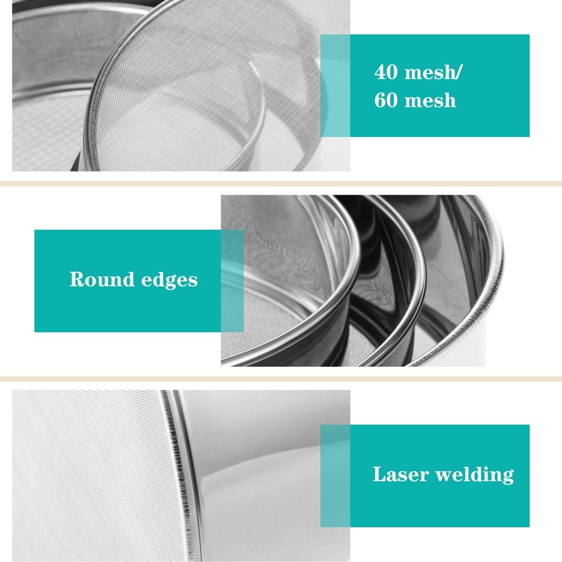 - You will get :3 pieces stainless steel round sifter include 60 mesh (6-inch and 8-inch) 40 mesh (7-inch) sieve fine mesh for bake decorate cakes, pies, pastries, cupcakes