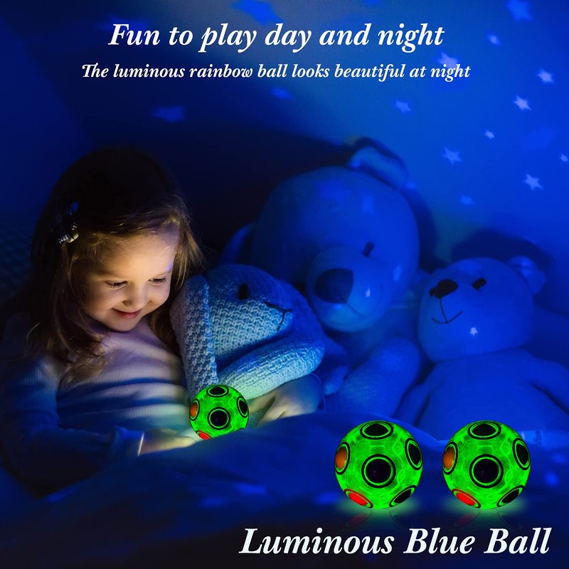 Features:The rainbow cube has a moderate size, which is easy to be operated by one hand.The luminous rainbow ball looks beautiful at night. It can exercise your memory and hand flexibility. The puzzle ball fits for piñata bag filler, classroom gift exchange, birthday party favor, Christmas stocking filler and so on.How to play:1. Scramble the colored balls.2. Push colored balls through to pass balls from one slot to another.3. Fidget balls to get them back to their matching slots.4. Match these balls to their corresponding colored rings to complete the puzzle.Specifications :Diameter: 2.7 inchColor: standard white, blue, greenMaterials: ABS materialPackage include:1 x Standard white rainbow balls1 x Blue rainbow balls (luminous green)1 x Green rainbow balls (luminous green)Note:People under 3 years use it under adult supervision.