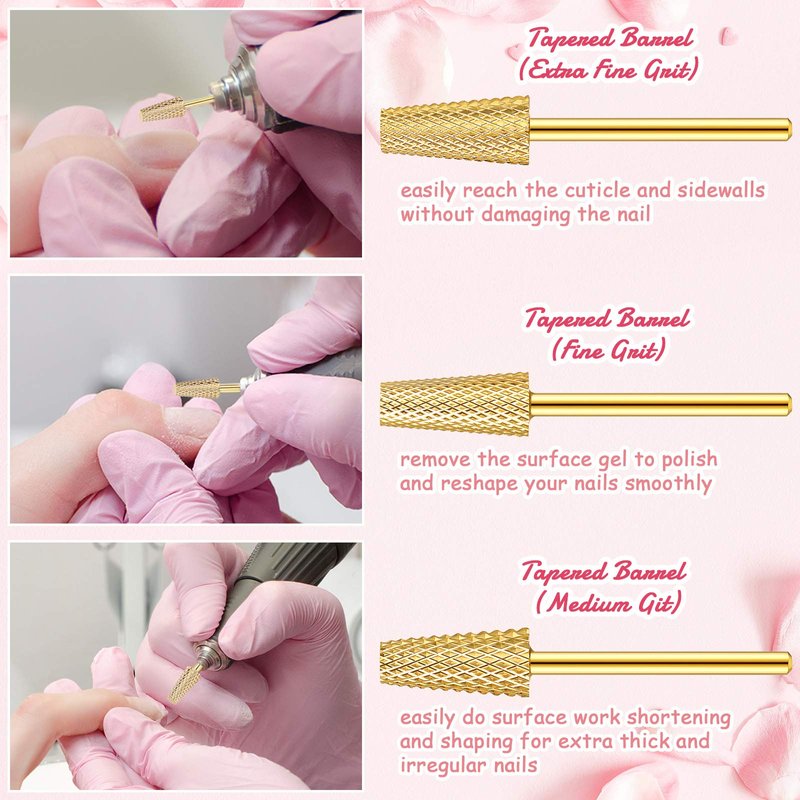 Package includes 3 pieces tapered barrel carbide nail drill bits in 3 different sizes with different coarseness, including extra fine, fine and medium, which fit most nail drill machines that use 3/32 inch bits, you can choose different sizes of drill bits to complete different nail art work according to your needs. Each drill bit is equipped with a base box, so you can quickly distinguish the size you want.