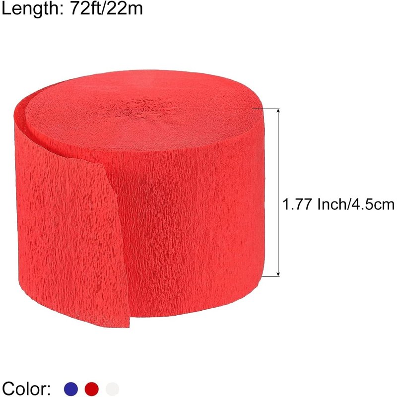 - 3 rolls of crepe paper streamers in 3 colors Party decor with this red, white, & blue patriotic streamer set! Each roll measures 25m long and 1.8-inch wide.