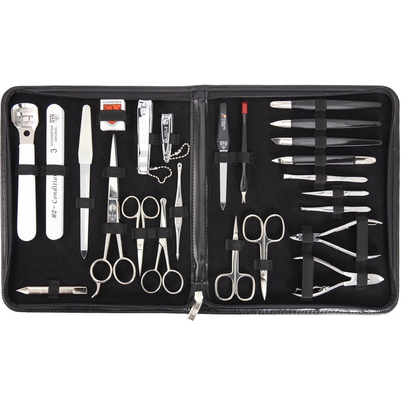 - CONTENTS: Cuticle scissors, nail scissors, cuticle nipper, nail nipper, tweezers oblique, tweezers pointed, tweezers straight, sapphire nail file, pusher/cleaner/scraper, double instrument, hoofstick, nail cleaner, blackhead remover, nail nipper, toe nail nipper, sapphire form file - curved blade, callus remover, corn rasp, hair scissors, nostril scissors, embroidery scissors.