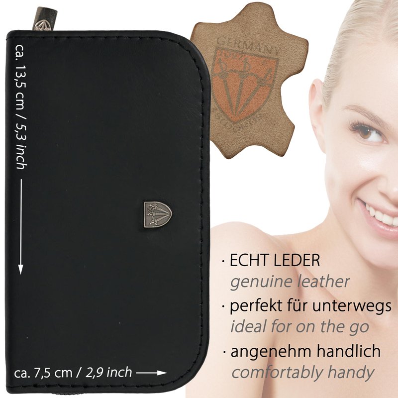 - CASE: Genuine leather black, size ca. 14,0 x 8,0 x 3,0 cm. Our organizers are made of high-grade fashion or classic materials. Additional equipment: Microfiber cleaning cloth for cleaning steel items, general info sheet “Finger - Nail Grooming”.