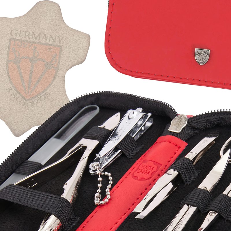 - CASE: Genuine leather red, size ca. 14,0 x 8,0 x 3,0 cm. Our organizers are made of high-grade fashion or classic materials. Additional equipment: Microfiber cleaning cloth for cleaning steel items, general info sheet “Finger - Nail Grooming”.