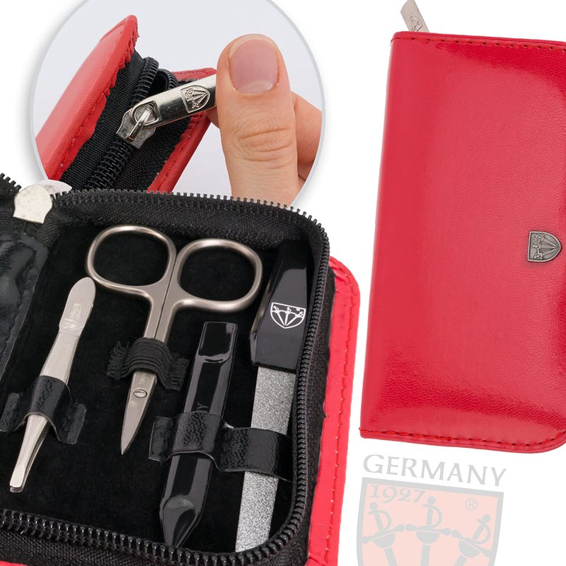 - CASE: Synthetic leather red, size ca. 13,5 x 7,5 x 2,5 cm. Our organizers are made of high-grade fashion or classic materials. Additional equipment: Microfiber cleaning cloth for cleaning steel items, general info sheet “Finger - Nail Grooming”.