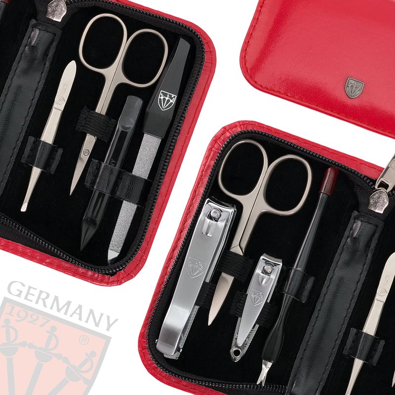 - STEEL IMPLEMENTS: Hand made, bright nickel plated and sandblasted / mat finished (protection against corrosion), polished and hardened. All sets come in an attractive gift box. Instruments are made in Solingen / Germany (except nail clippers).